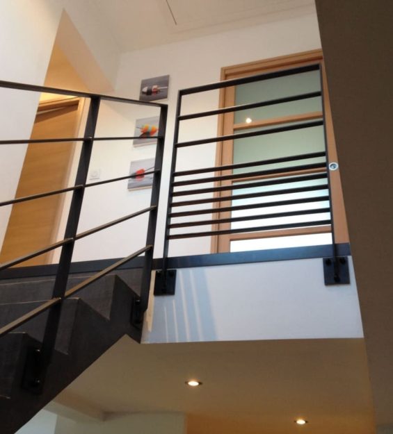 Finesse de l’acier et transparence du verre, caractérisent ce garde-corps qui sécurise ce petit couloir bordant la trémie d’escalier.